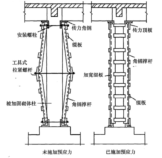 (4)外加预应力撑杆加固法:各位有车的哥们用过千斤顶吗?对,就是这个东西,再看看这个图,是不是有点似曾相识的感觉,技术就是这样,车上可以用,建筑同样可以用。